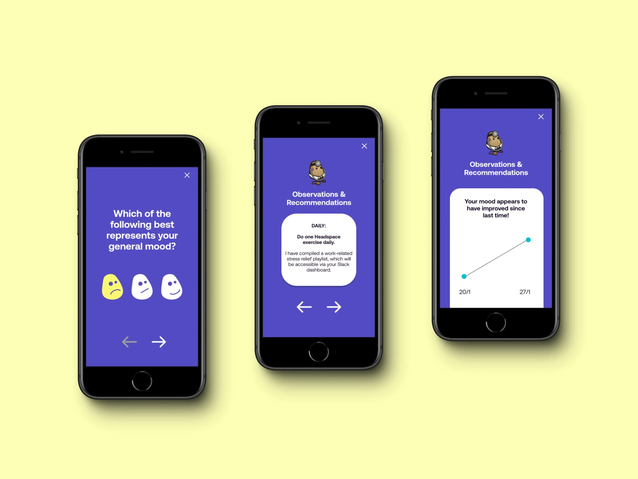 One feature that stood out in user testing was the ability to view improvements in mood on a visual chart, using data collected during regular mood check-ins, with participants saying it would actively encourage continued use of the app and adherence to recommended activities. Adherence would lead to increased employee satisfaction, as well as peripheral benefits like boosted performance and productivity at work.